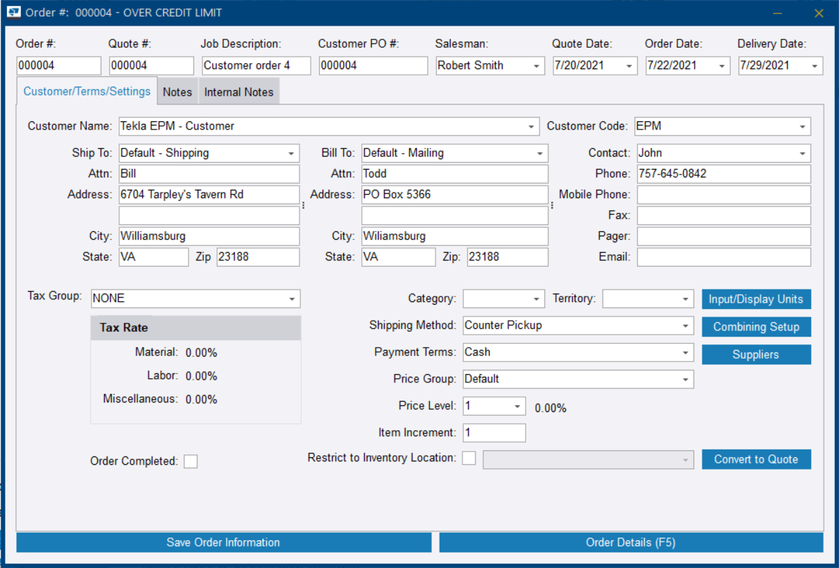 Le cas échéant, modifiez le devis ou le numéro de commande en haut de la boîte de dialogue Informations sur la commande.