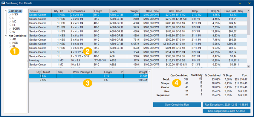 (4) Zone de synthèse : Imbrication des résultats avec le nombre total de barres de la longueur sélectionnée, le pourcentage de riblons et le coût total des matières. Le coût des matières représente les prix des matières dans la base de données des prix utilisée dans la passe d’imbrication.