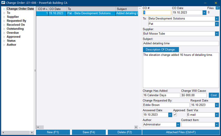 Tekla PowerFab renseigne automatiquement le champ Ordre de changement n° avec le prochain numéro d’entrée disponible. Vous pouvez modifier le numéro.