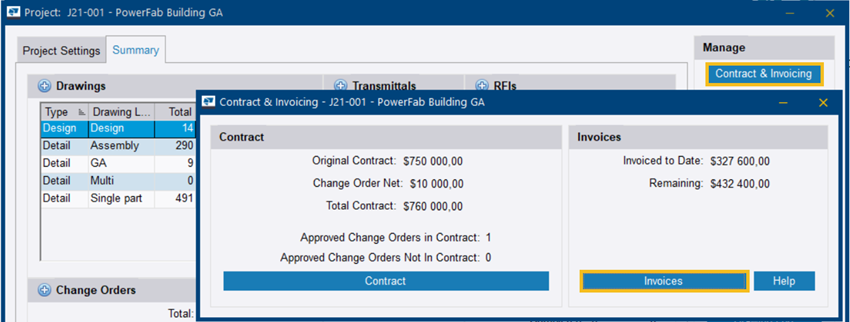 Dans la boîte de dialogue Factures, vous pouvez créer de nouvelles factures pour des éléments de contrat, modifier ou supprimer des factures existantes et créer des documents de facturation standard ou des rapports de facturation.