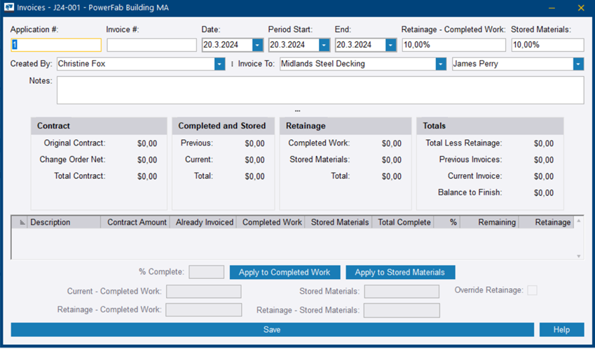 Pourcentage de rétention appliqué aux matières stockées. Saisissez une valeur dans le champ Matières stockées. Note : Quand vous créez la facture finale, la valeur doit être définie sur 0 %, afin que la rétention retenue sur les factures précédentes puisse être facturée. |