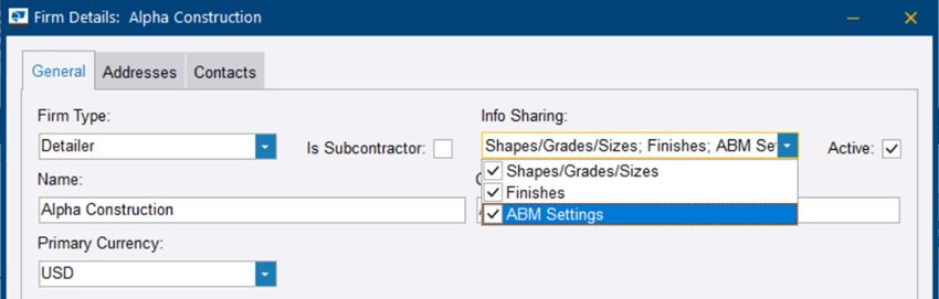 Pour le type d'entreprise Bureau d'étude, vous pouvez partager les formes, les nuances, les tailles, les finitions et les paramètres de liste d'approvisionnement avec cette entreprise. Cela permet au bureau d'étude d’utiliser vos paramètres pour le processus de soumission.