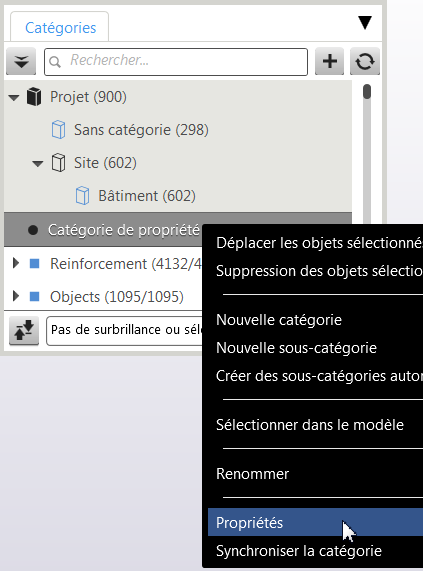 Vous pouvez créer des catégories de propriétés pour ajouter des propriétés aux objets du modèle. Vous pouvez utiliser des attributs utilisateur existants dans les catégories et y ajouter des valeurs. Vous pouvez également créer dans l'Organisateur des attributs utilisateur sous forme de propriétés personnalisées et les utiliser dans les catégories de propriétés.