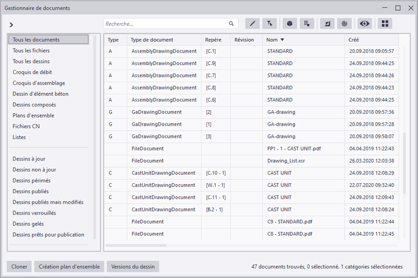 Vous pouvez organiser, geler, afficher et masquer des colonnes, modifier certaines données de liste directement et organiser les documents et les dessins en catégories, par exemple. Vous pouvez ouvrir des dessins, et si une application correspondante est installée, vous pouvez ouvrir d'autres types de fichiers, tels que des fichiers PDF, CN ou DWG. Le Gestionnaire de documents dispose d'un puissant outil de recherche qui prend en charge les caractères jokers et les opérateurs de recherche les plus courants. Vous pouvez enregistrer vos recherches dans les catégories basées sur la recherche et créer des catégories manuelles.