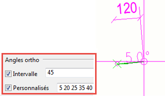 Utilisez l'outil Ortho pour accrocher le point orthogonal le plus proche dans un dessin. Vous pouvez indiquer l'angle orthogonal dans Paramètres d'accrochage du dessin (). L'option d'accrochage orthogonal se révèle utile si vous devez placer des notes associatives de manière homogène ou créer un polygone selon un certain angle, par exemple. Vous pouvez utiliser des angles orthogonaux prédéfinis et spécifier des angles personnalisés.