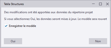 Lorsque Tekla Structures détecte une modification entre les données du modèle local et les données du répertoire projet ou société Trimble Connect, la notification suivante s'affiche :