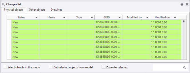 Les objets modèles et les dessins sont importés. Un contrôle de révision est effectué si vous importez un projet dans un autre. Les modifications sont affichées à l'aide de la même liste que celle utilisée dans Tekla Model Sharing.