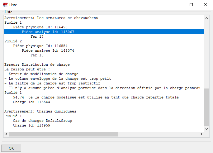 Tekla Structures affiche une liste détaillée des avertissements et des erreurs. Par exemple :