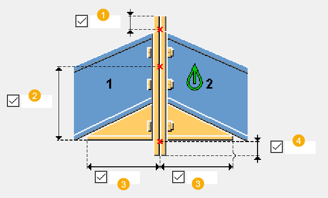 Hauteur épure jarret Distance verticale entre l'intersection de l'axe central de l'arbalétrier principal et la ligne verticale entre les platines, jusqu'à l'intersection des ailes inférieures des jarrets sur la même ligne verticale. |