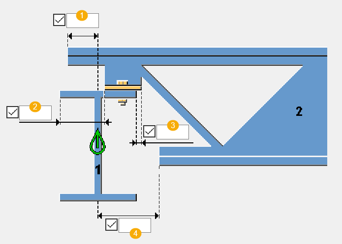 Poutrelle-poutre (type 1) (160) crée une attache boulonnée entre une poutre et une poutrelle. Vous pouvez définir la taille de la cornière d'assise et l’emplacement des boulons.