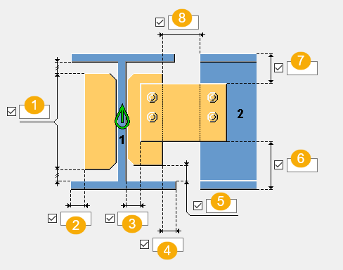 Automatique L'aile de la poutre secondaire est entièrement coupée vers l'arrière de la longueur que vous définissez. La profondeur par défaut du grugeage représente deux fois l'épaisseur de l'aile. La coupe s'effectue toujours sur l'intégralité de la largeur de l'aile de la secondaire. |