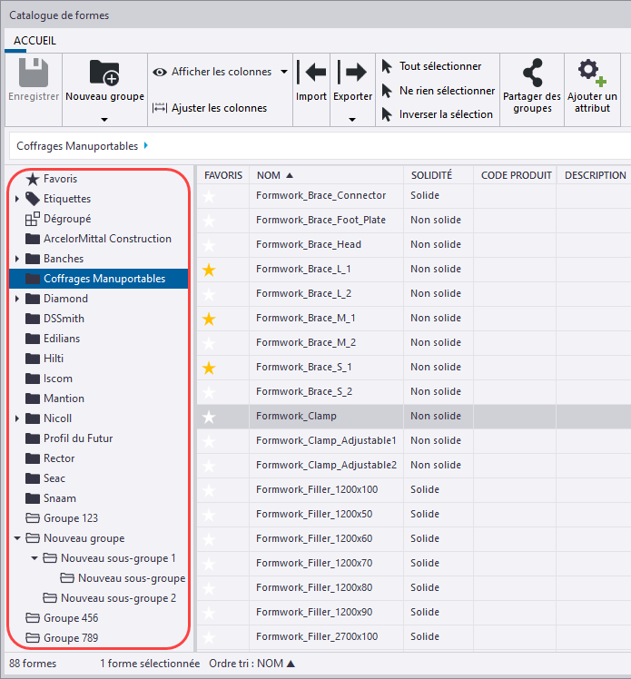 Si vous êtes un administrateur Tekla Structures ou l'utilisateur principal, vous pouvez disposer de formes organisées en groupes dans un projet. Vous pouvez ensuite partager la structure du groupe afin que vos groupes définis par l’utilisateur deviennent des groupes système et soient disponibles pour tous les utilisateurs dans le modèle partagé.