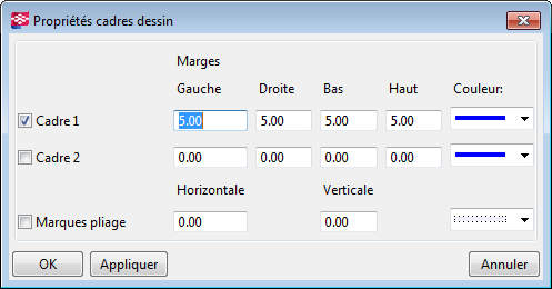 - Dans la boîte de dialogue Propriétés cadres dessin, cochez les cases des cadres que vous voulez imprimer.
