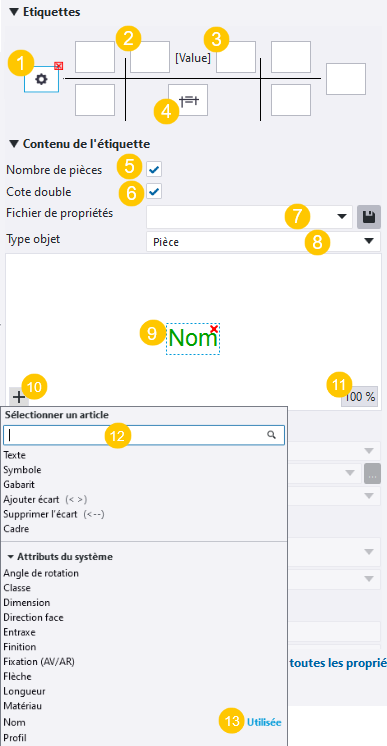 (1) Conteneurs d'étiquette disponibles autour de la ligne de cotation. Cliquez sur un conteneur d'étiquette pour le sélectionner. Utilisez le bouton rouge de suppression dans l'angle supérieur droit du conteneur pour supprimer le contenu. Vous pouvez entrer du texte ou cliquer sur le bouton Dans les étiquettes, vous ne pouvez pas utiliser d'attributs de gabarits tels que (2) Étiquette de préfixe (3) Étiquette de suffixe (4) Étiquette Cotation double (5) Case à cocher Nombre de pièces : Lorsque vous cliquez sur un conteneur d'étiquette, la case à cocher Nombre de pièces devient disponible. Lorsque vous cochez la case, l'étiquette sélectionnée affiche le nombre de pièces. (6) Case à cocher Cotation double : Lorsque vous cliquez sur le conteneur d'étiquette (4), la case à cocher Cotation double devient disponible. Lorsque vous cochez la case, les cotes doubles sont appliquées. (7) Fichier de propriétés: Chargez un ensemble de contenus d'étiquettes de cotations prédéfinies. Vous pouvez également enregistrer le contenu des étiquettes. (8) Type objet: Définissez le type de l'objet de construction que vous cotez. Les options sont Pièce, Boulon, Armature, Traitement de surface et Objet de coulage. Ce paramètre n'est pas disponible lorsque vous avez sélectionné une cotation dans un dessin ouvert. (9) Éditeur d'étiquette pour ajouter du contenu dans les étiquettes de cotation. Vous pouvez faire glisser des éléments vers un autre emplacement à l'intérieur d'un conteneur d'étiquette. Cliquez sur le bouton de suppression rouge (10) Liste d'éléments. Cliquez sur le bouton plus (11) Le bouton % affiche le niveau de zoom actuel dans l'aperçu. Vous pouvez effectuer un zoom avant ou arrière en faisant défiler le bouton central de la souris. Cliquez sur le bouton pour zoomer pour un ajustement optimal. (12) Zone de recherche pour la recherche d'éléments. Entrez l'élément que vous souhaitez trouver. Si vous ne trouvez pas l'attribut utilisateur souhaité dans la liste, vous pouvez entrer le nom de l'attribut dans la zone de recherche et appuyer sur Entrée pour l'ajouter. (13) Si vous avez déjà ajouté un élément dans une étiquette, l'élément est marqué avec le texte Utilisée dans la liste des éléments. |