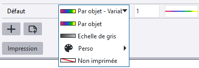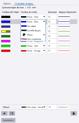 Pour utiliser une seule couleur et une seule épaisseur de ligne dans l'impression pour tous les objets, définissez la couleur et l'épaisseur de ligne souhaitées pour la ligne Défaut et supprimez toutes les lignes de propriété de ligne. Si vous sélectionnez Par objet, les couleurs des objets de dessin sont utilisées à l'impression telles qu'elles le sont dans le dessin. |