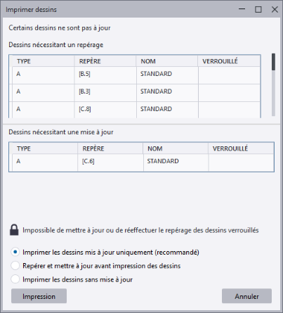 Ajoutez l'indice de la dernière révision du dessin imprimé au nom du fichier d'impression. Le numéro de révision est utilisé par défaut. Si vous souhaitez toujours utiliser l'indice de révision à la place, définissez l'option avancée XS_SHOW_REVISION_MARK_ON_DRAWING_LIST sur TRUE. Si l'indice de révision n'est toujours pas affiché, vérifiez les options avancées suivantes et incluez REVISION_MARK dans la valeur : XS_DRAWING_PLOT_FILE_NAME_A, XS_DRAWING_PLOT_FILE_NAME_W, XS_DRAWING_PLOT_FILE_NAME_G, XS_DRAWING_PLOT_FILE_NAME_M ou XS_DRAWING_PLOT_FILE_NAME_C, en fonction du type de dessin. Cette option est disponible uniquement si vous avez sélectionné Fichier PDF ou Fichier dessin. Voir également l’article d’assistance Inclure le repère de révision du dessin dans le nom du fichier d’impression. |