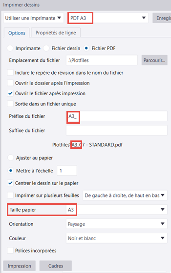 - PDF A3: Format de papier défini sur A3, préfixe de fichier défini sur A3_