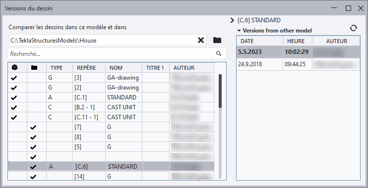 La liste des versions des dessins est utile lorsque vous souhaitez revenir à une version antérieure du dessin pour une raison quelconque. Le contrôle de la version est également disponible dans Tekla Model Sharing, et vous pouvez désormais mieux contrôler les modifications non intentionnelles apportées aux dessins et revenir à la version possédant le contenu approprié.