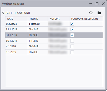 TRUE, cochez la case Toujours nécessaire dans la boîte de dialogue Versions du dessin. Définissez l’option Toujours nécessaire individuellement pour chaque version de dessin que vous souhaitez conserver en cochant la case correspondante.