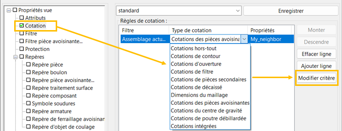 Vous pouvez à présent sélectionner les propriétés de vue enregistrées dans le panneau Création de vue. Ces propriétés de vue contiennent les propriétés de cotation enregistrées.