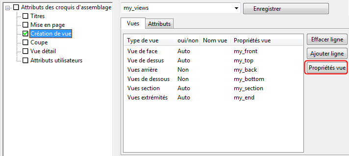- Dans les propriétés du dessin, cliquez sur l'option Création de vue dans l'arborescence des options. Vous pouvez alors sélectionner les vues à créer et les propriétés de vue à utiliser.