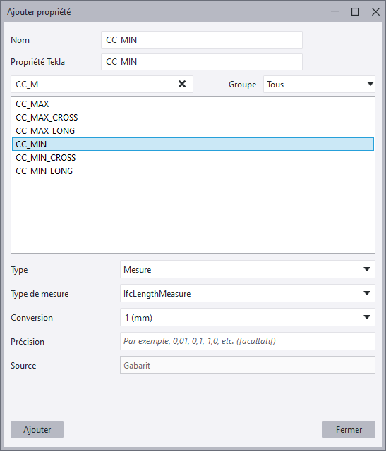 Les jeux de propriétés buildingSMART sont protégés et vous ne pouvez pas y ajouter de propriétés. Les jeux de propriétés dont le nom commence par Pset_ ou Qto_ sont des jeux de propriétés buildingSMART. Cependant, vous pouvez modifier les propriétés incluses dans les jeux de propriétés buildingSMART.