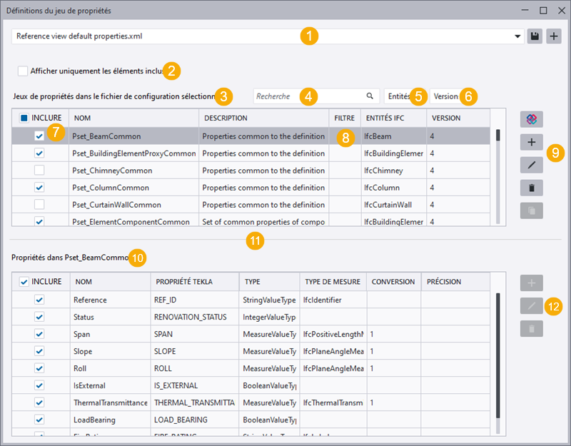 (6) Afficher uniquement les jeux de propriétés pour les versions IFC sélectionnées.