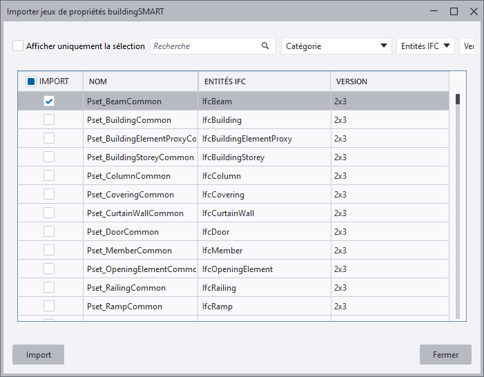 (5) Afficher uniquement les jeux de propriétés pour les entités IFC sélectionnées.