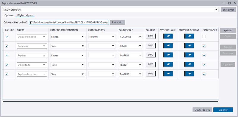 Exportez le dessin Tekla Structures à l'échelle dans l'espace modèle vers un fichier CAO. Lorsque l'option Exporter uniquement dans l'espace objet est utilisée, les coordonnées du modèle, globales et du point de base, ainsi que le choix d'espace papier/d'espace objet dans les paramètres de calque/niveau seront ignorés.