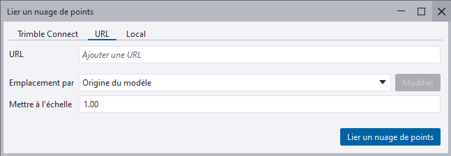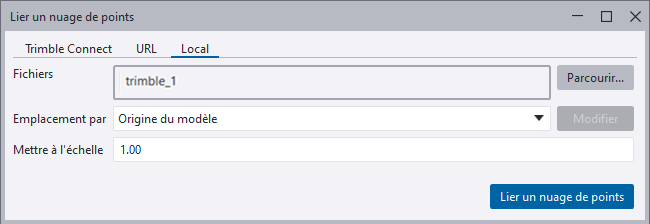 - Vous pouvez attacher un nuage de points localement, à partir d’Internet ou en utilisant le service de plate-forme Trimble Reality Capture (TRCPS).