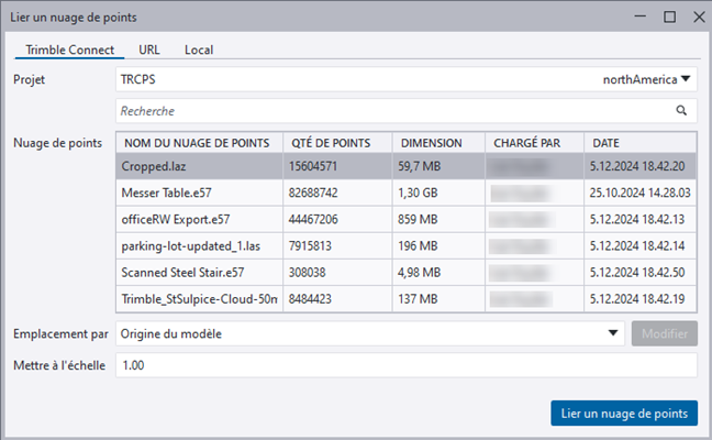 - Lorsque vous attachez et affichez des nuages de points enregistrés dans le service de plate-forme Trimble Reality Capture (TRCPS), vous n’avez pas besoin de stocker des fichiers de nuages de points volumineux localement sur votre ordinateur. Vous pouvez également attacher des nuages de points hébergés dans un projet existant Trimble Connect .
