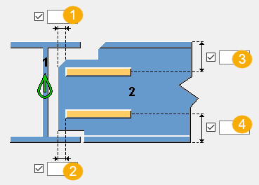 Coupe+soudures avec jeu (49) soude une poutre à une autre poutre. Vous pouvez définir la coupe de l'extrémité de la poutre. L'attache crée également des raidisseurs horizontaux si nécessaire.