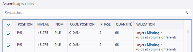 parcourir la liste des assemblages et éléments béton cibles et corriger les erreurs possibles avant d’exécuter le repérage.