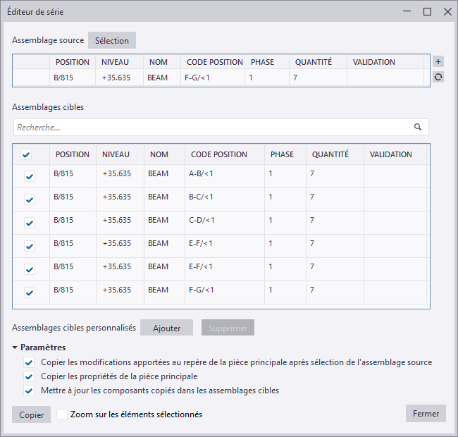 Utilisez la liste pour copier toutes les modifications effectuées dans l'assemblage ou l'élément béton source vers les assemblages ou les éléments béton cibles en une seule fois.