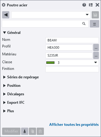 Utilisez le panneau des propriétés pour afficher et modifier les propriétés des pièces. Vous pouvez afficher et modifier les propriétés d'un seul type de pièce à la fois, ou les propriétés actuelles de plusieurs types de pièces similaires.