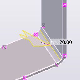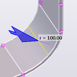 Lorsque vous créez un plat plié, Tekla Structures ajoute une section courbe entre les pièces que vous sélectionnez. Vous pouvez modifier la section courbe en choisissant une des options prédéfinies ou en modifiant la forme manuellement. Vous pouvez également modifier les sections plates, c'est-à-dire les pièces d'origine du plat plié.