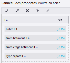 Tekla Structures affiche les propriétés de l'objet du modèle ou de dessin dans le panneau des propriétés. Utilisez l'Editeur du panneau des propriétés pour personnaliser le panneau des propriétés pour qu'il convienne mieux à vos besoins. Vous pouvez sélectionner séparément pour chaque type d'objet les propriétés que vous souhaitez afficher dans le panneau des propriétés. Vous pouvez afficher, masquer et organiser les paramètres dans le panneau des propriétés, et ajouter les attributs utilisateur les plus fréquemment utilisés directement sur le panneau des propriétés.