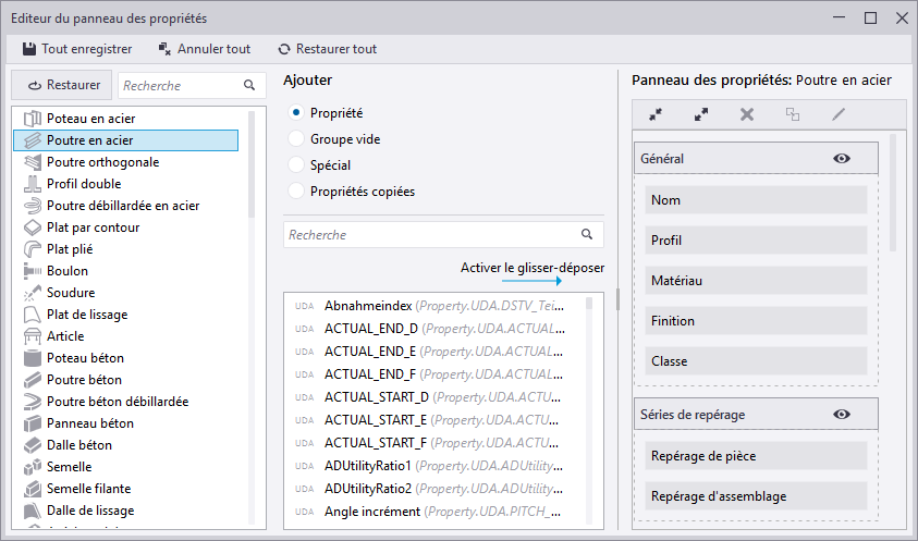 Liste des propriétés au milieu. La liste répertorie toutes les propriétés disponibles pour chaque objet du modèle ou de dessin. Pour les objets du modèle, les attributs utilisateur pour chaque type d'objets sont également affichés. Vous pouvez ajouter ces propriétés et attributs utilisateur à la personnalisation du panneau des propriétés sous forme de propriétés normales. Les propriétés qui sont déjà utilisées ne peuvent pas être ajoutées une deuxième fois mais vous pouvez les réorganiser dans la personnalisation du panneau des propriétés. Les propriétés qui ne sont pas compatibles avec le type d'objet sélectionné ne peuvent pas être ajoutées.