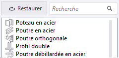 Certains types d'objets du modèle ont des attributs utilisateur qui font partie d'un groupe d'attributs et/ou sont masqués dans l'Editeur du panneau des propriétés. Par exemple, l'enrobage béton Inférieur appartient au groupe Enrobage béton pour jeux d'armatures. Si vous devez utiliser ces attributs individuellement, vous pouvez les trouver en entrant __ (double trait de soulignement) dans la zone de recherche de la colonne centrale. Vous pouvez également utiliser ces attributs dans les gabarits. Par exemple, pour ajouter l'enrobage béton Inférieur dans un gabarit de liste, utilisez la formule du champ valeur GetValue("USERDEFINED.__CovThickBottom").
