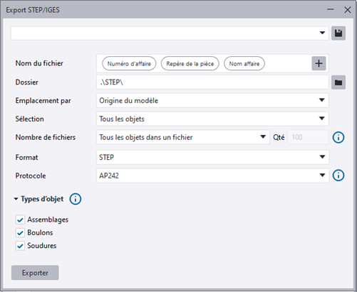 Vous pouvez choisir d'inclure Assemblages, Boulons ou Soudures dans l'export. Si vous sélectionnez Assemblages, les pièces acier sont exportées en tant qu’assemblages entiers. Dans le cas contraire, les pièces acier sont exportées en tant qu’objets uniques.