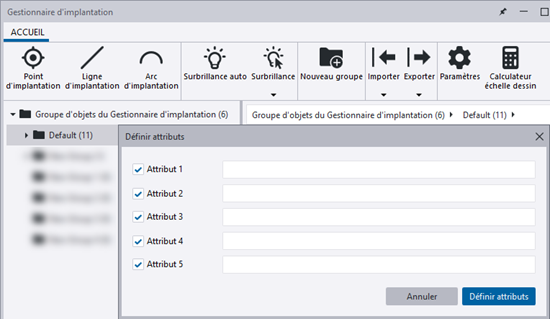 Vous pouvez désormais ajouter des attributs utilisateur à des groupes de points dans la nouvelle boîte de dialogue Définir attributs pour simplifier la gestion et l’identification sur le chantier. Cliquez avec le bouton droit de la souris sur un groupe du Gestionnaire d'implantation pour ouvrir la boîte de dialogue.
