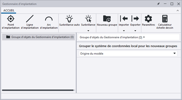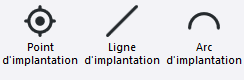 Vous pouvez désormais créer des points, des lignes et des arcs d’implantation à l’aide des commandes de la boîte de dialogue Gestionnaire d'implantation. Les boutons de commande du ruban Gestionnaire d'implantation ouvrent des boîtes de dialogue dans lesquelles vous pouvez définir les propriétés.