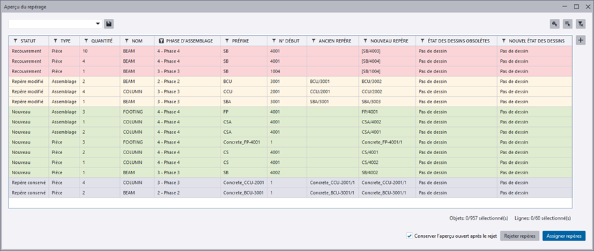 La nouvelle boîte de dialogue Aperçu du repérage s'ouvre lorsque vous lancez une commande de repérage, Repérer les objets modifiés ou Repérer les séries d'objets sélectionnés dans le ruban, ou les commandes du menu Fichier.