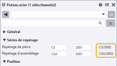 Après le repérage, vous pouvez désormais voir les repères réels des pièces, assemblages, éléments béton et assemblages d’armatures sélectionnés dans le panneau des propriétés, à côté du préfixe et du numéro de début. Par exemple :