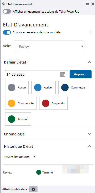 En outre, vous pouvez désormais partager les statuts entre Tekla Structures et Tekla PowerFab, grâce à la collaboration en temps réel et au suivi de projet, obtenir instantanément l'état du fabricant sans avoir besoin d'export et d'import manuels. Si vous utilisez Etat d'avancement entre Tekla Structures et Tekla PowerFab, vous pouvez filtrer les actions dans Tekla Structures afin que seules les actions de Tekla PowerFab soient visibles.