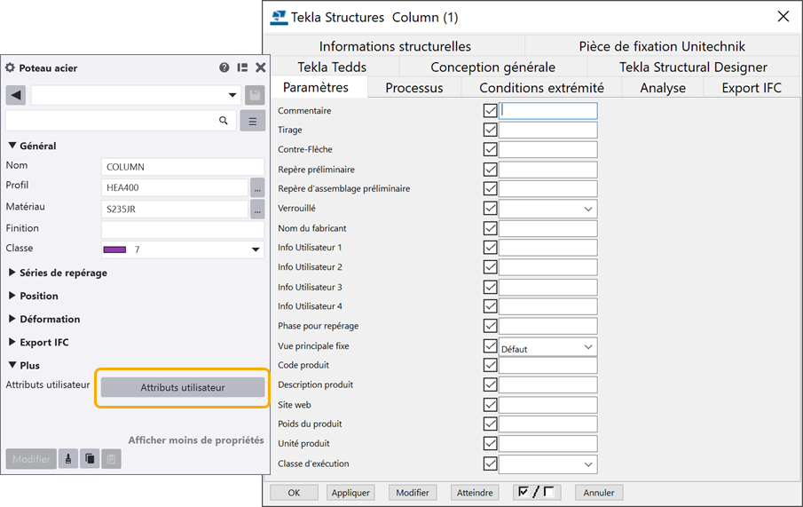 Le panneau des propriétés et de nombreuses boîtes de dialogue contiennent des attributs utilisateur pour différents objets, y compris des poutres, poteaux, boulons et dessins. Tekla Structures affiche ces champs lorsque vous cliquez sur le bouton Plus dans le panneau des propriétés ou sur le bouton Attributs utilisateur dans une boîte de dialogue.