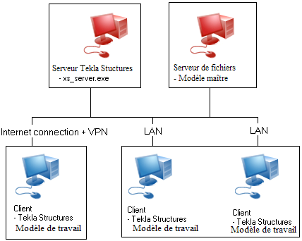 Le système multi-utilisateurs peut comprendre plusieurs ordinateurs clients, sur lesquels les utilisateurs travaillent sur leurs modèles de travail. Le modèle maître peut se trouver n'importe où sur le réseau, y compris sur l'un des ordinateurs clients.