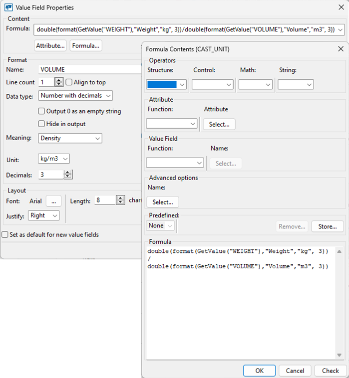 Cet attribut renvoie la valeur en millimètres cubes par défaut. Vous pouvez facilement modifier l’unité dans les Propriétés champ texte de l'Éditeur de gabarits si vous utilisez simplement la fonction GetValue dans une formule pour obtenir le volume. Toutefois, si vous utilisez cet attribut dans une formule contenant des opérations arithmétiques, vous devez mettre en forme les unités de poids et de volume en utilisant simultanément les fonctions de format et de double. Cela est dû au fait que les millimètres cubes sont également utilisés dans les calculs par défaut.