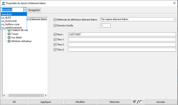 Pour plus d’informations sur les dessins d'éléments béton, voir Créer plan de fabrication et Propriétés des dessins d'éléments béton.