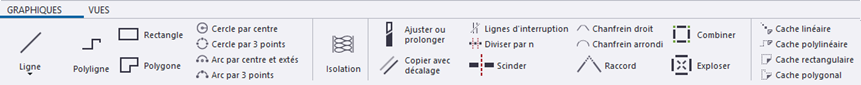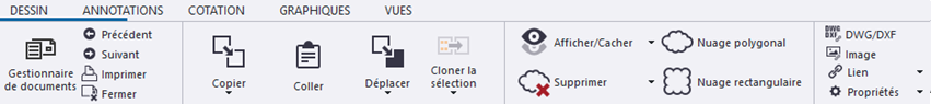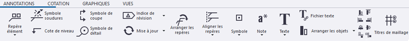 Les objets de dessin comprennent les objets de construction (pièces, boulons, soudures, chanfreins, armature, traitement de surface, etc.), les objets d’annotation (repères, notes, cotations, textes, objets liés, nuages, objets de référence, etc.) et les objets graphiques (lignes, rectangles, cercles, etc.).